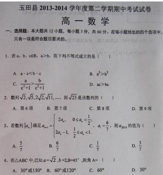 河北省玉田县2013-2014学年高一下学期期中考试(数学)扫描版