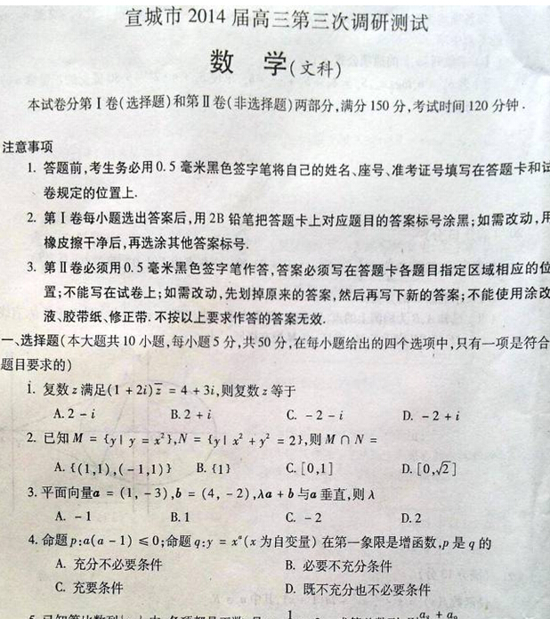 安徽省宣城市2014届高三第三次教学质量检测(数学文)扫描版