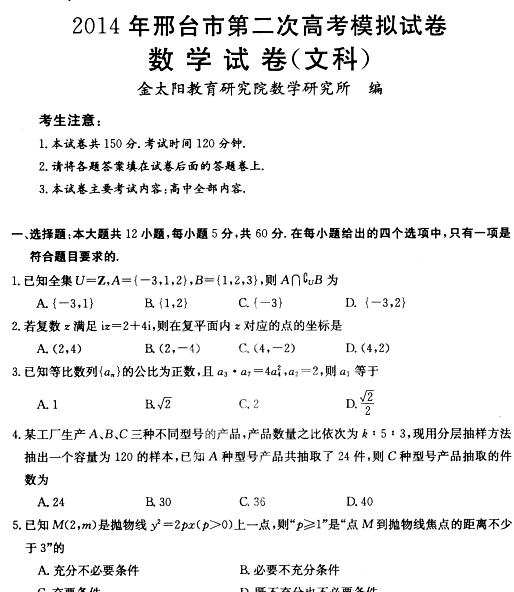 河北省邢台市2014届高三第二次模拟考试(数学文)扫描版