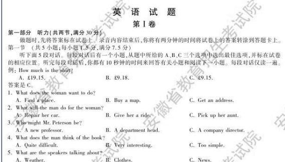 2014年普通高等学校招生全国统一考试(安徽卷)英语 扫描版(有答案)