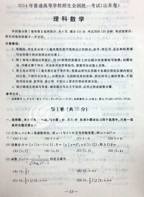 2014年普通高等学校招生全国统一考试山东卷(数学理)扫描版