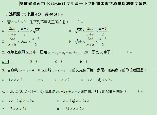 安徽省淮南市2013-2014学年高一下学期期末教学质量检测试题(数学)
