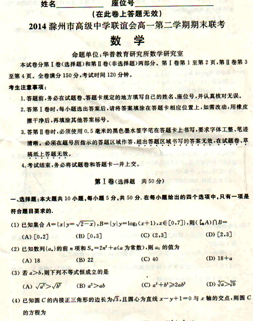安徽省滁州市高级中学联谊会2013-2014学年高一下学期期末联考(数学)(扫描版)