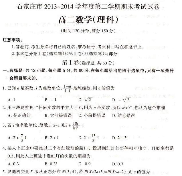 河北省石家庄市2013-2014学年高二下学期期末考试(数学理)(扫描版)