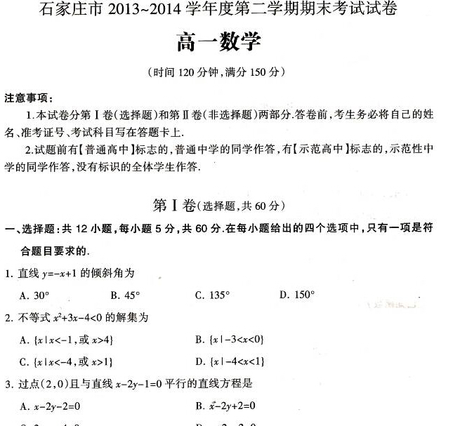 河北省石家庄市2013-2014学年高一下学期期末考试(数学)(扫描版)