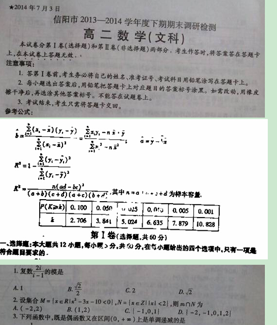 河南省信阳市2013-2014学年高二下学期期末调研检测(数学文)扫描版