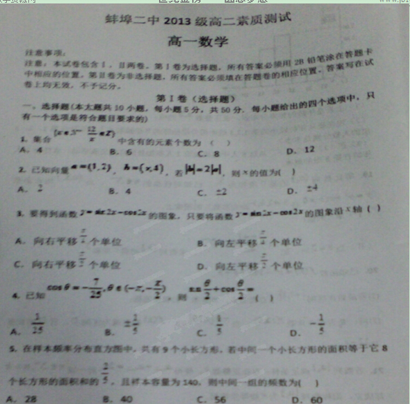 安徽省蚌埠二中2014-2015学年高二开学素质综合测试(数学)(扫描版,无答案)