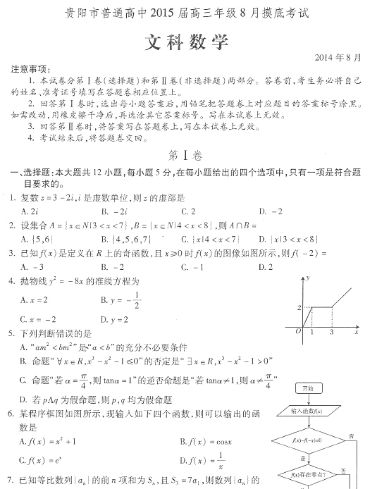 贵州省贵阳市普通高中2015届高三8月摸底考试(数学文)扫描版
