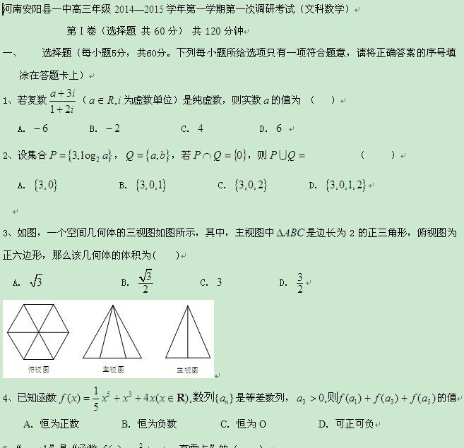 河南省安阳市安阳县一中2015届高三上学期第一次调研考试(数学文)