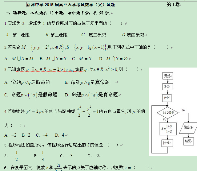 四川省成都市新津中学2015届高三入学考试(数学文)