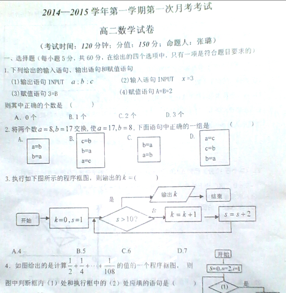 河北省保定市高阳中学2014-2015学年高二9月月考(数学)扫描版缺答案