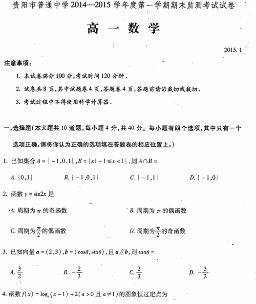 贵州省贵阳市2014-2015学年高一上学期期末考试(数学)扫描版