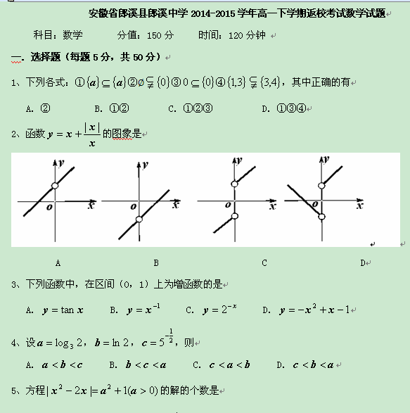 安徽省郎溪县郎溪中学2014-2015学年高一下学期返校考试(数学)