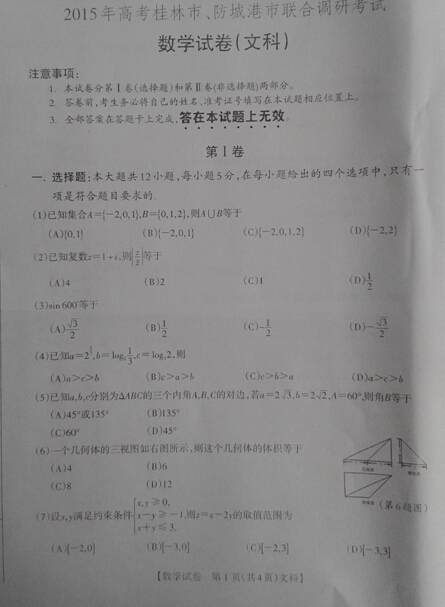 广西桂林市、防城港市2015届高三联合调研考试(数学文)扫描版